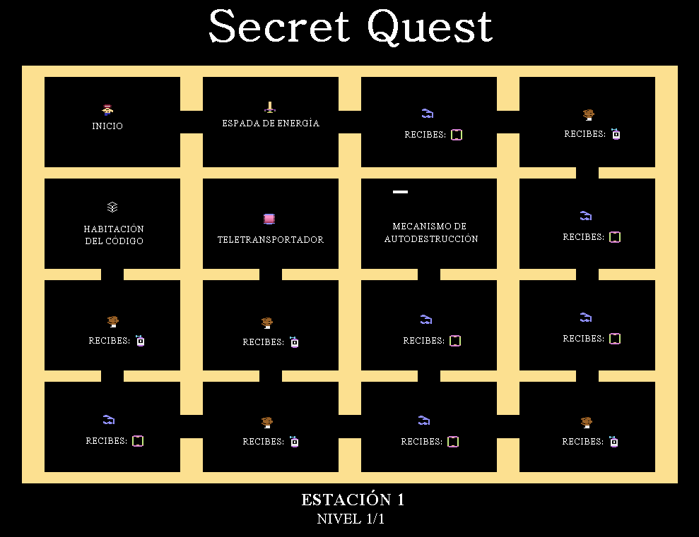Aquí os dejo de momento el nivel 1 en imagen. Iré construyendo los demás que son un poco más complicadetes por tener varios pisos. Había incluido la energía de cada rival en cada habitación, pero al rejugar fui descubriendo que no siempre necesitaban el mismo número de impactos para morir. Desconozco si lo que varía es la energía de los monstruos, la fuerza del arma (aunque en el manual se especifica cuánta fuerza tiene cada una) o bien si depende de las pulsaciones, la posición o lo que sea. Por ello me limito a poner el objeto que dejan caer, que sí parece ser constante durante todo el juego (las trampas para osos dan energía, los hombres patata dan una botella de oxígeno, etc.).
